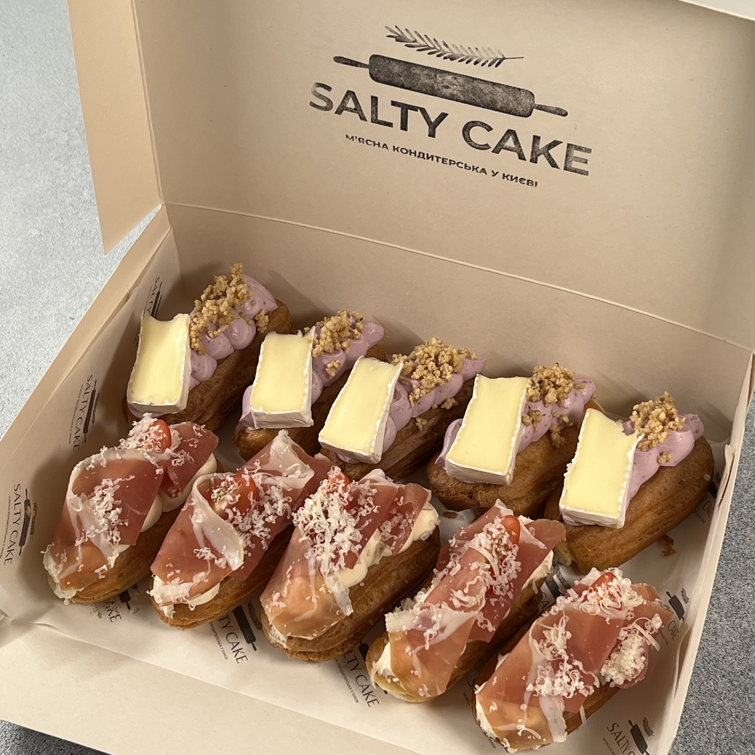 5 міні еклерів з камамбером та кремом з чорної смородини;